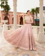 Ruzova is a breathtaking ensemble that reflects timeless elegance and the beauty of traditional craftsmanship. Designed in a graceful floor-length pishwas silhouette, this outfit is crafted from delicate powder pink net fabric, creating a soft and romantic look perfect for festive occasions.