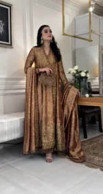 The ASWAD Ensemble by Haris Shakeel is a majestic creation that reflects timeless elegance and regal charm. Designed in a luxurious bronze-gold hue, this outfit showcases exquisite craftsmanship and refined designer aesthetics.