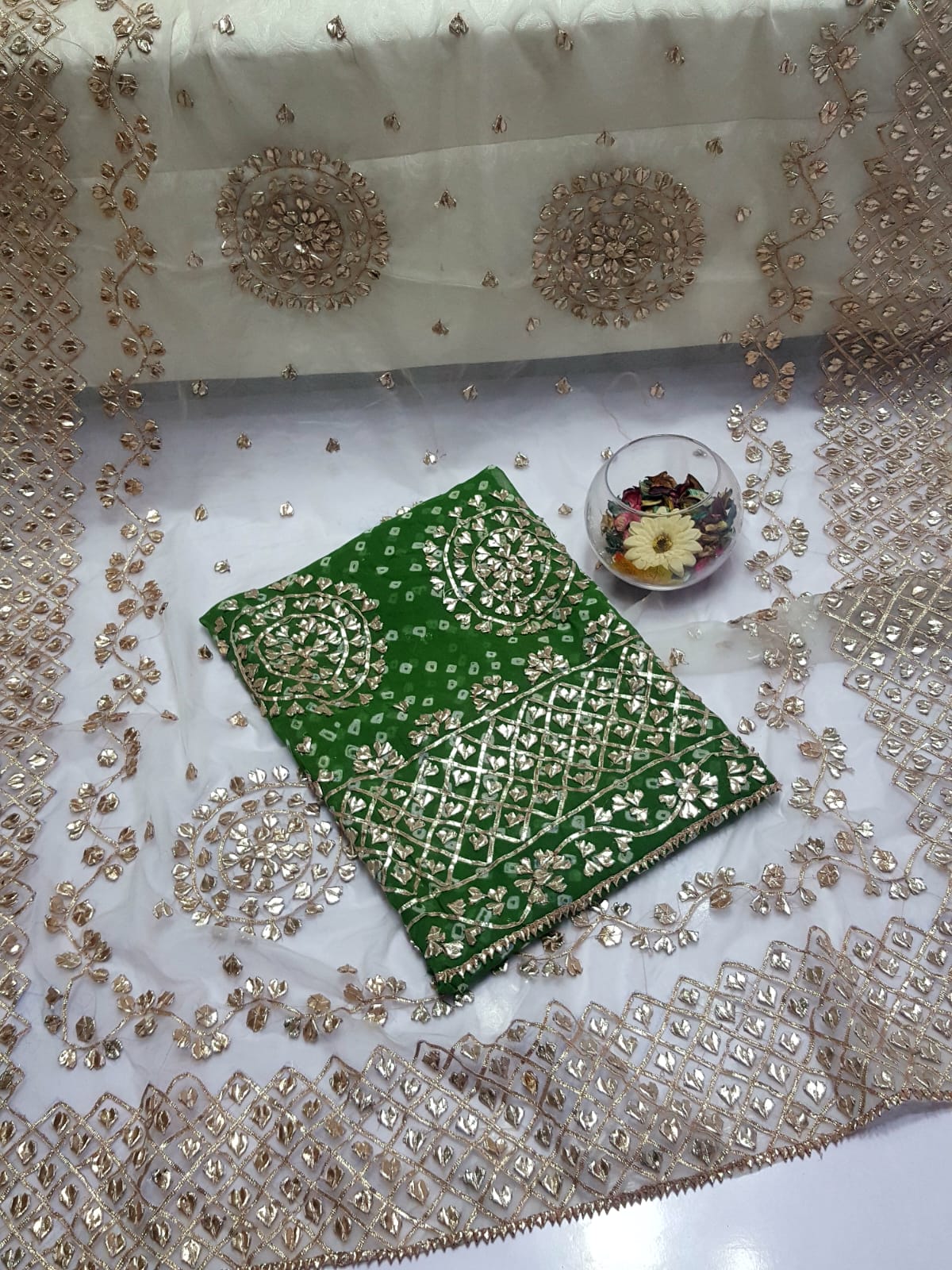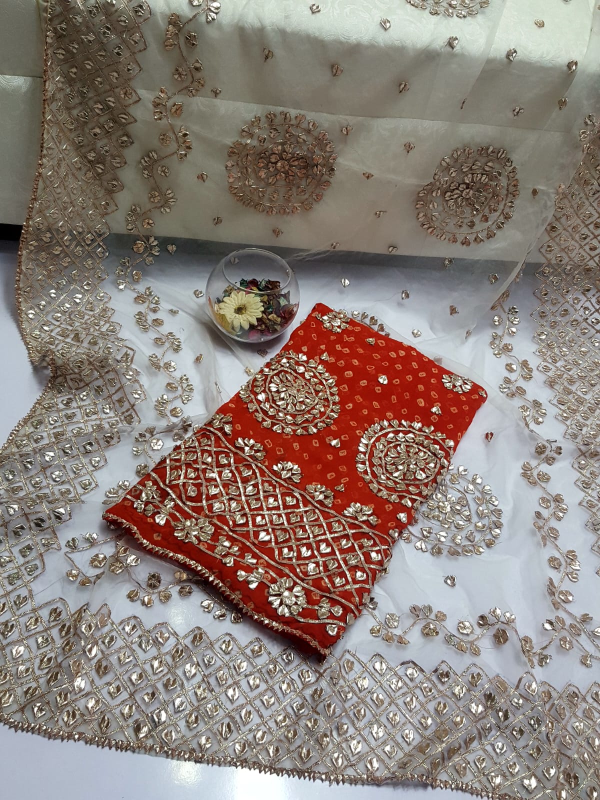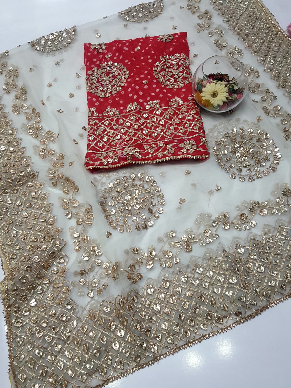Fabric: Pure Organza Rose Gold LCD Gotta work Pure chiffon Chunri Heavy New Style Work