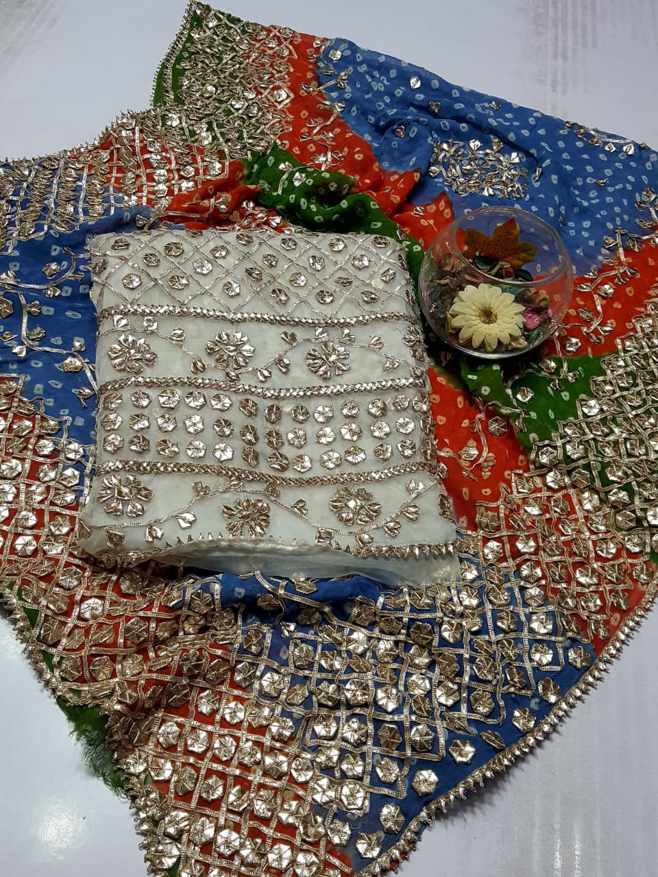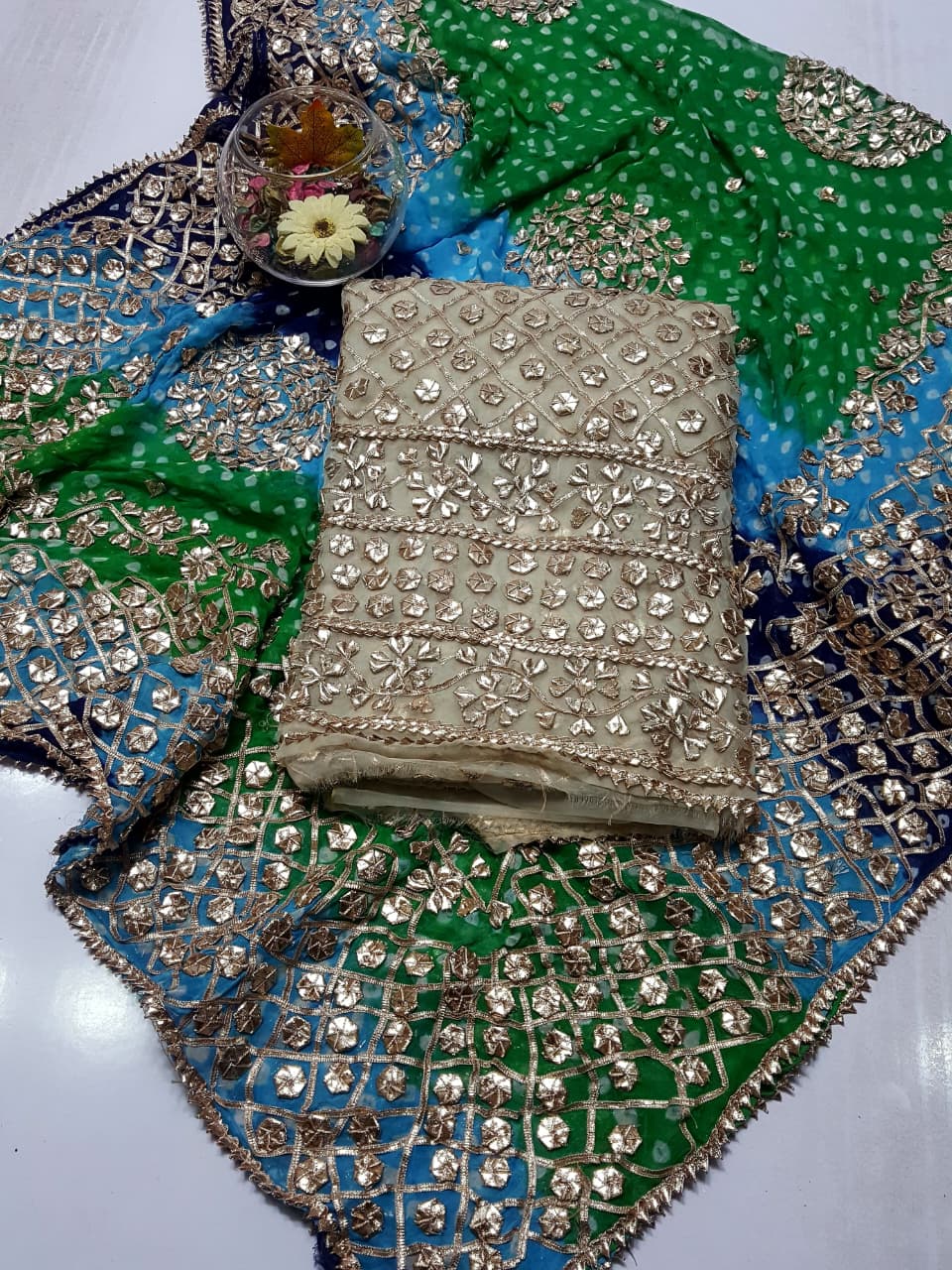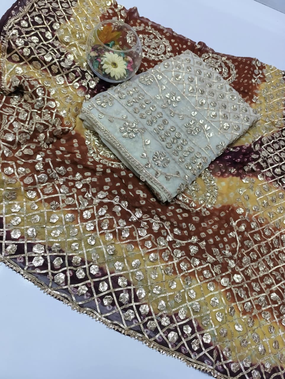 Fabric: Pure Organza Rose Gold LCD Gotta work Pure chiffon Chunri Heavy New Style Work